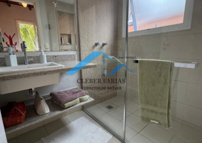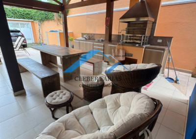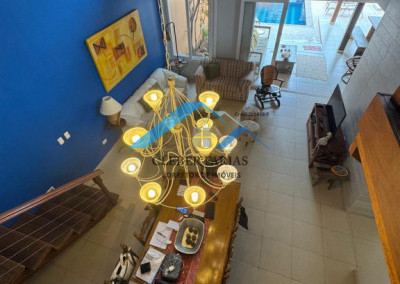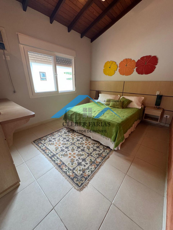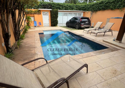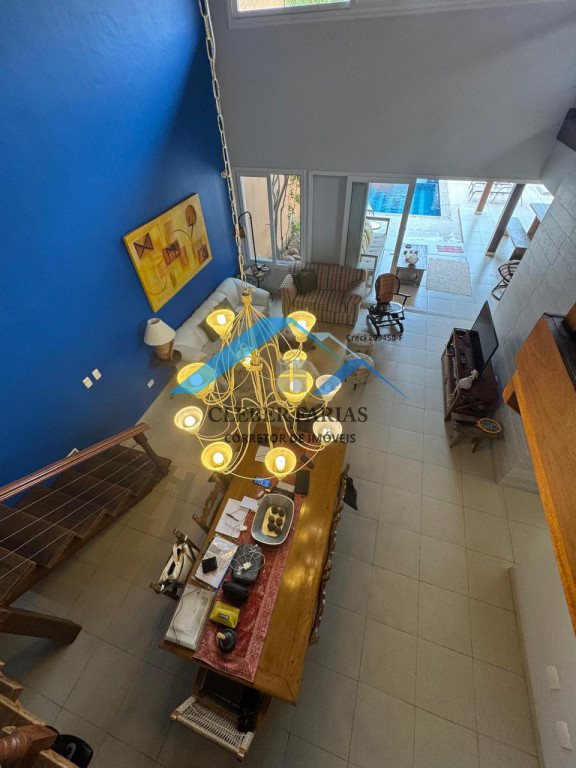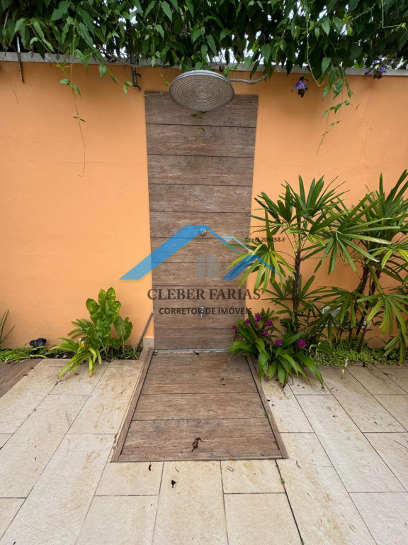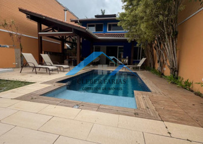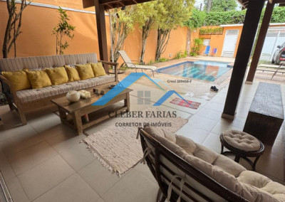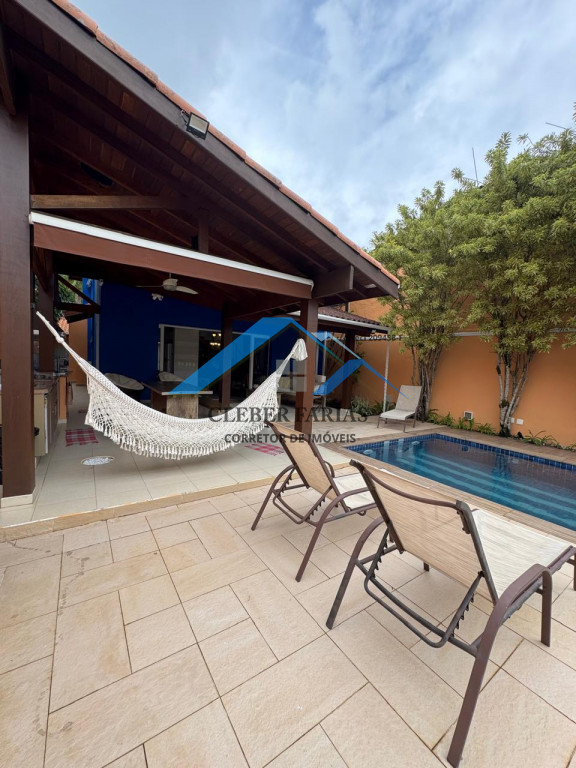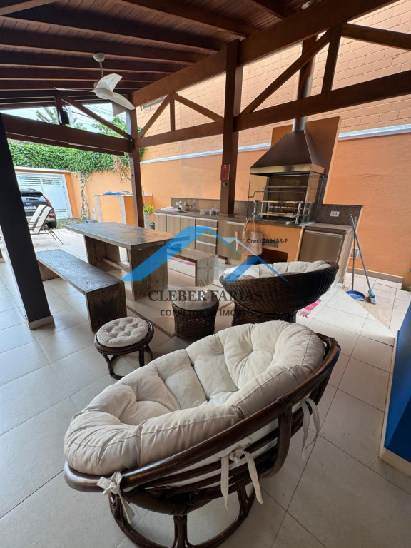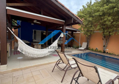 Casa possui três quartos, sendo 3 suítes, 4 banheiros e 1 lavabo, 2 vagas de carros, sala, cozinha, mezanino, área de churrasqueira, piscina, lavanderia e armário de apoio para guarda utensílios de praia .